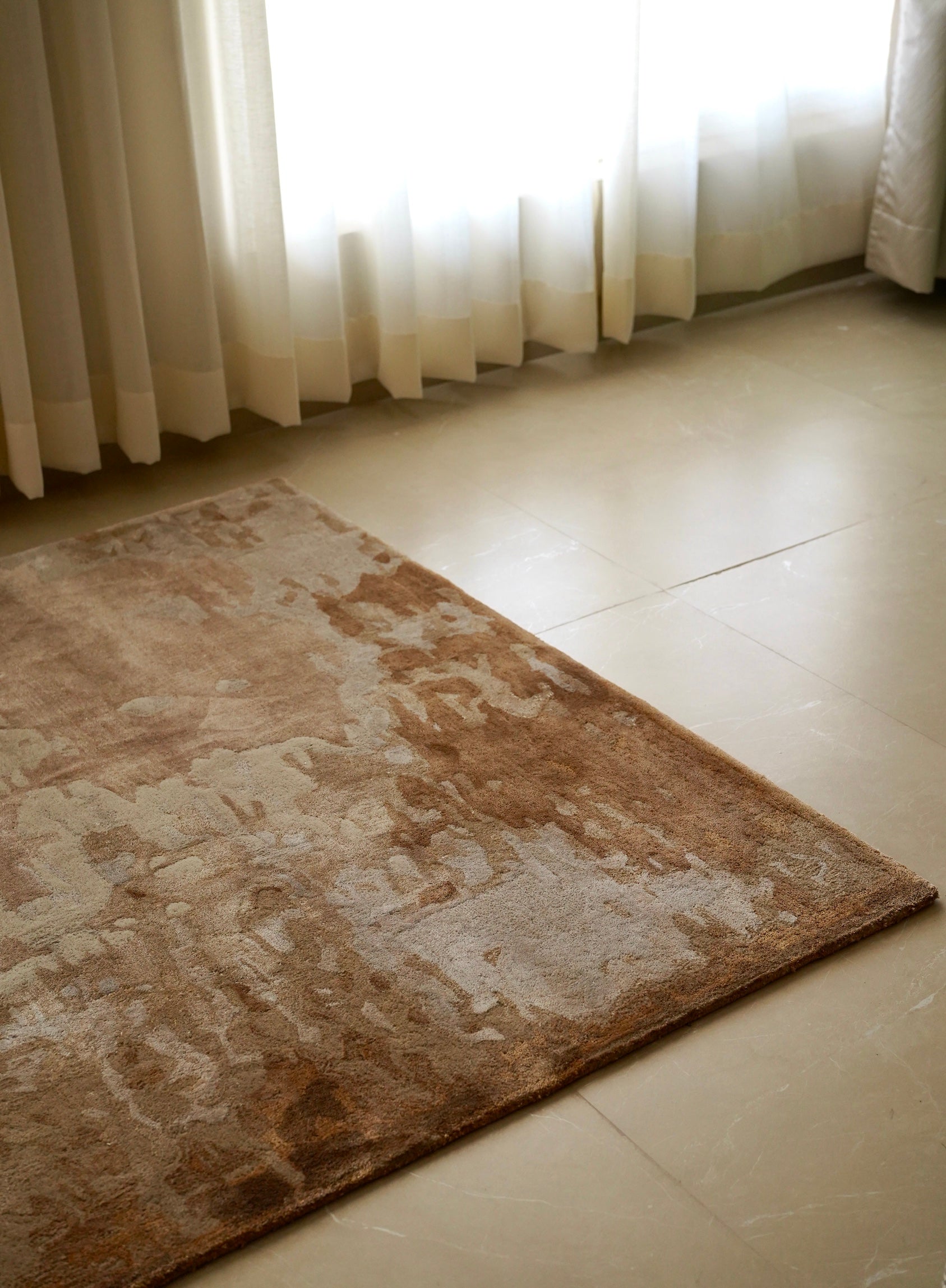 This elegant carpet features a warm blend of neutral tones, including beige, soft browns, and light ivory, balanced by cooler grey undertones. Its abstract design evokes the natural textures of weathered stone or the interplay of light on uneven surfaces, creating a harmonious and sophisticated visual. The pattern flows seamlessly, adding depth and character to contemporary interiors.