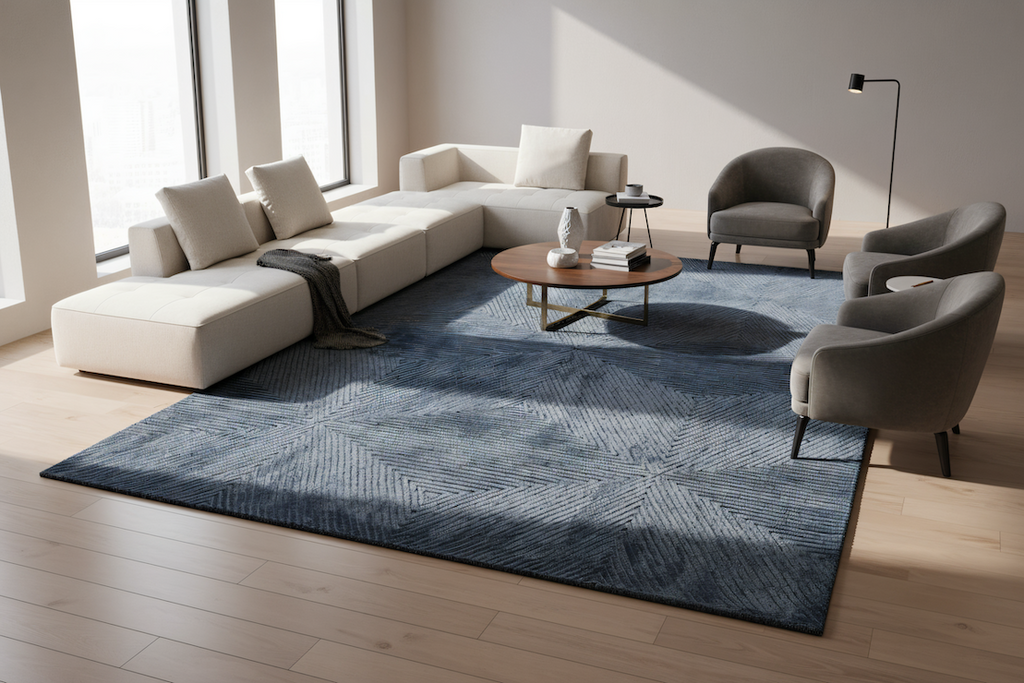 This modern rug showcases an intricate geometric pattern of intersecting lines forming starburst shapes. The rich indigo blue tones, accented with subtle shading, create depth and a striking visual effect. The combination of texture and color lends a sophisticated charm to contemporary and transitional interiors, making it a standout centerpiece.